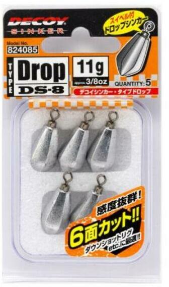 A Decoy DS-8 Sinker Type Drop drop shot ólmok környezetbarát anyagból készülnek, amely nem szennyezi a környezetet. A különleges kialakítás nagyon jó aerodinamikát biztosít, és javítja a teljesítményt mind dobás, mind behúzás közben, megnöveli a szerelékek hatékonyságát.
