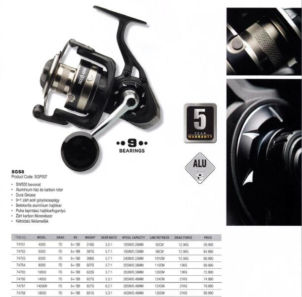 A zord, sósvízi körülmények komoly horgászfelszerelést igényelnek. Mit szólnátok egy olyan orsóhoz, mely egyedi bevonatának hála könnyedén elviseli, ha 500 órán át sós vízzel fecskendezve tesztelik? Ez az új SGS8, SW500 bevonattal. Persze, az orsó nem csak ettől sósvízálló. 9+1 acél golyóscsapágy, zárt fékrendszer, valamint könnyű és erős alumínium ház és meg