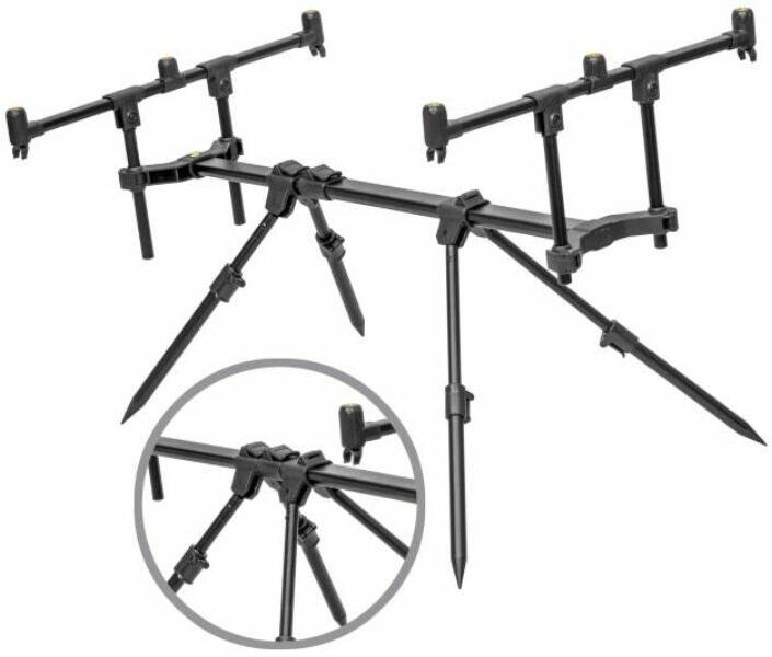 Exkluzív megjelenésű, prémium feketére porfestett alumínium rod pod, mely a környezeti viszonyokhoz igazodva kétféleképpen: a központban vagy a keresztmerevítő végein elhelyezett lábállással is használható. Három kompletten felszerelt bojlis bot tárolására alkalmas, a buzz bar magassága állítható. A teleszkópos lábaknak köszönhetően magassága szabályozható. Az el