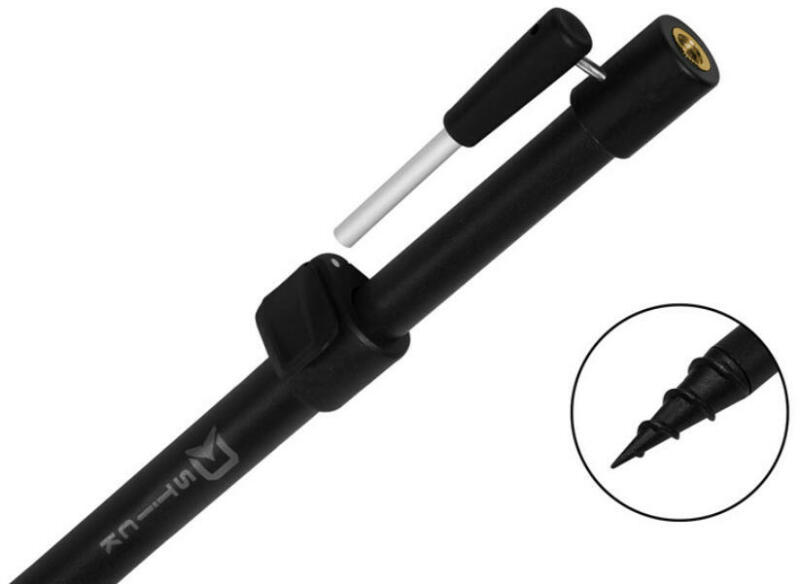 A Delphin D-STICK teleszkópos leszúró bottartó fúróspiccel. Már az első ránézésre látható a robusztus, mégis könnyű termék prémium kivitele. Alapját vastagfalú csövek képezik melyek szilárdak, fekete matt felületkezelése biztosítsa a hosszú élettartamot. Ez a modell innovatív széthúzó és rögzítő mechanizmussal készül, mely minőségi ABS műanyagból gyártód