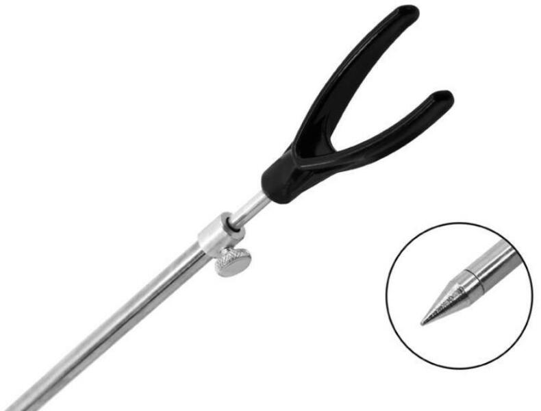 Rendkívül szilárd és stabil teleszkópos leszúró műanyag "V" bottartóval. Acélból készült, ennek köszönhetően kivételesen szilárd. A szükséges magasságot egyszerűen beállíthatja a bottartó magasságának rögzítésére szolgáló anyás menet segítségével. Az alsó rúd külső átmérője 8 mm, a felső rúd külső átmérője pedig 4,8 mm.