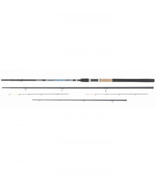 Medium erősségű, parabolikus akciójú, 80g dobósúlyú feeder horgászbot. Kiváló választás rövidebb és közepes távolságok meghorgászására. Anyaga a jól bevált CX1 Micro Pitch Carbon. Két részes botról van szó, a tagok csatlakozásánál extra erősítéssel. A két tag mellé még 3db - különbőző erősségű - üvegyanta spicc tartozik. A bot dupla lábas K-Sic gyűrűz