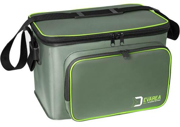 A Delphin EVAREA Pocet egy téglalap alakú univerzális műanyag táska 36x23x25cm méretben, különféle horgász felszerelések vagy apró cikkek tárolására. A táska keményített formatartó EVA anyagból készül. A táska matt katona zöld és piros cipzárral van ellátva, ami bezárja a táska fedelét és az első zsebet. Az alsó rész vízhatlan műanyagból készül, és ha valami
