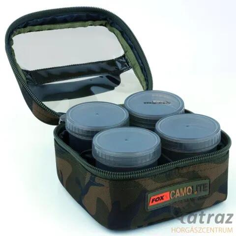 Táska Fox Camo Glug 6 Pot Case - Diptartó (CLU311)Egyedi Fox camo mintázatErős duplacipzárral2 normál méretű csalis tégely4 kisméretű csalis tégelyPárnázott elválasztókSzínezett PVC fedéllel az egyszerűbb csali azonosítás érdekében100%-ban kezelt 500-as poliészter anyagMéretek: 24 x 10,5 x 15,5 cm