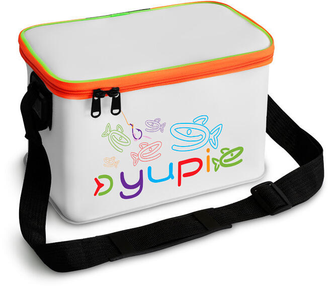 Delphin YUPIE Gyerek CarryAll EVA Táska Vidám mintával gyerekek részére Sokoldalúan használható EVA anyagból készült Könnyen tisztítható Vállpánttal Sokoldalú CarryAll táska fiatal horgászok számára horgászfelszerelésük tárolására és szállítására. Ez a fehér táska piros cipzárral zárható, ami jellegzetes zöld szalaggal rendelkezik. A dizájnt színes grafikák