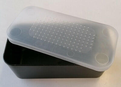 1 pintes (0,6 literes) doboz, lyukacsos tetővel. Ideális választás pelletek áztatásához, kisebb mennyiségű etetőanyag vagy csonti tárolásához. A dobozok úgy lettek kialakítva, hogy nem tapadnak össze, ha egyberakva tároljuk őket.