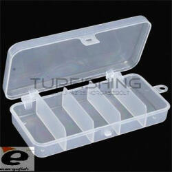 A mini műcsalis doboz mérete 6x13 cm, 5 egyforma fakkra van osztva. Tárolhatunk benne wobblert, gumihalat, villantót egyaránt. Twisterálló, tehát a gumihal anyaga nem "marja" szét! Praktikusságának köszönhetően azt is megtehetjük, hogy egy-egy gyors pecára csak pár darab műcsalit viszünk magunkkal. Pont annyit, amennyi belefér a dobozba. Jó minőségű műanyagból készült,
