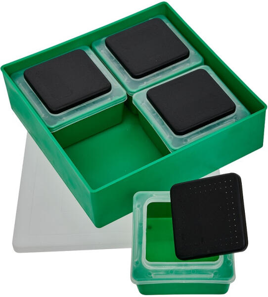 Élő csali tároló készlet, fedéllel 4 + 1. Méretek 1x 18x18 cm és 4x 8,5x8,5 cm.