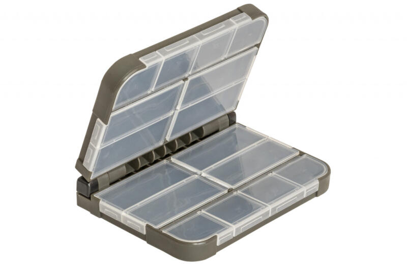 Horgok, kapcsok, forgók és egyéb apró kiegészítő tárolására alkalmas, lepkeszerűen kihajtható aprócikkes doboz. A különböző méretű, összesen tizenhat darab rekesznek és a jól záródó, áttetsző fedélnek köszönhetően a benne elhelyezett felszerelés könnyen áttekinthető. Méreténél fogva akár a mellényzsebben is elfér. Őrök darab, olyan horgászoknak ajánljuk