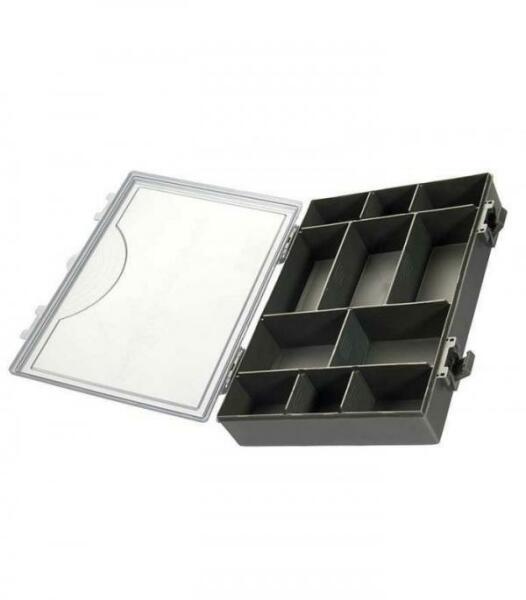 Praktikus horgászdoboz, melybe minden olyan kiegészítő elfér, melyre a peca során szükség lehet. A kivehető térelválasztó elemeknek köszönhetően a belső kiosztása igény szerint alakítható. Fedele áttetsző, így tartalma annak felnyitása nélkül megtekinthető. Praktikus füllel és masszív, jól záródó csatokkal látta el a gyártó. Időt spórolhatunk meg azzal, ha k