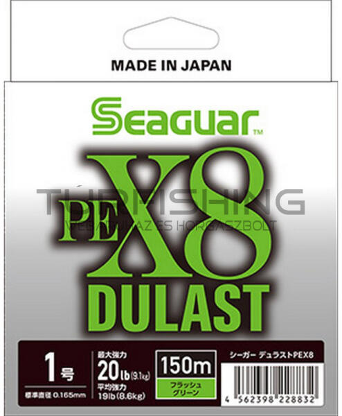 Seaguar Dulast PEX8 Flash Green fonott zsinór 150m Az új Seaguar DULAST 8 szálas fonott zsinór japán IZANAS fonatból készül, mely a legmagasabb minőséget képviseli. A speciális bevonat hosszú élettartamot biztosít a szálaknak, kevesebb kopás és szétválás mellett. A Flash Green színezés nagyon jó láthatóságot tesz lehetővé édesvízi és sósvízi horgászat során is,