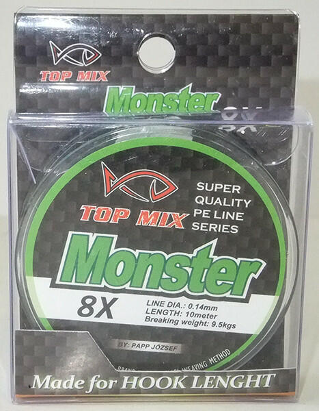 Magas minőségű, 8 szálból font, tökéletesen kőrszövött felsőkategóriás fonott előkezsinór család. Nagyteljesítményű, a 8 szálnak köszönhetően teljes hosszában tökéletesen kör keresztmetszetű a zsinór. Zöld színe beleolvad a környezetébe, a halak számára szinte láthatatlan. 10 méteres kiszerelésben kerül forgalomba. Átmérő/szakítószilárdság:- 0,08mm - 5