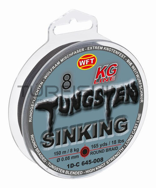 WFT Tungsten süllyedő fonott zsinór A WFT Tungsten KG Sinking egy teljesen új változat a gyorsan süllyedő fonott zsinórok között. Az UHMPE bevonatos felület és a fonat TUngsten részecskékkel való ellátása biztosítja a legjobb süllyedési paramétereket a zsinór teljes élettartama alatt. Ennek a technológiának köszönhetően, a süllyedési paraméterek mellett, jó csomót