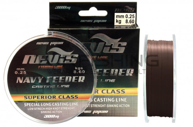Kifejezetten a feederhorgászok igényeinek kiszolgálására lett kifejlesztve a NAVY FEEDER zsinórcsalád. Rozsdabarna szín, megfelelő lágyság, kontrollált nyúlás, gyors süllyedés és magas kopásálló képesség jellemzi ezt a monofil zsinórt, ezért nagyon hosszú az élettartama. Segítségével a távoli dobások is pontosan hajthatók végre. A féderezés mellett használható