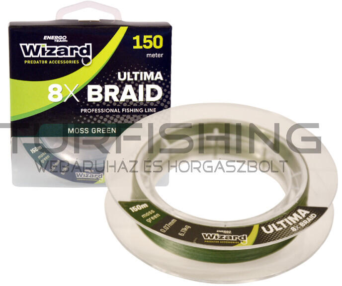 Wizard Ultima 8X Braid Moss Green fonott zsinór 150m A Wizard rablóhalas szortiment legújabb tagja, az elvárásokat felülmúlva, egy következő fokozatot képvisel termékeink között, kifejezetten megemelve a kiváló ár-érték arány fogalmát. Az Ultima 8X Braid nevéből is már asszociálva, egy 8 szálas pergető fonott zsinór, melynek szálai japán minőségi keretek között let