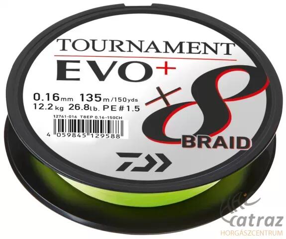 Daiwa Tournament 8 Braid Evo+ Fonott Zsinór - Chartreuse 135 méter 0,10 mm A közismert Tournament 8 Braid-et az EVO+ kivitelben tovább optimalizálta a Daiwa csapata. Különös figyelmet kapott a felületkezelése egy magasabb szilikontartamú bevonattal lett ellátva. Így a zsinór surlódási ellenállása még alacsonyabb dobáskor, ez még jobb dobástávokat jelent a jövőre nézve. Ez