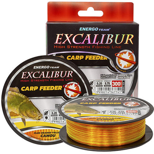 ET Excalibur Carp Feeder Fluo narancs - citromsárga átmenetes camou zsinór 300m az Excalibur szériájának legújabb tagja, Carp Feeder, Camou változatban, kétféle szín összeállításában, mely jelen esetben Fluo narancs és citromsárga keveréke. Az élénk fluo változatnak hála az éjszakai horgászatok során is megfelelő választás a zsinór, de a 2 szín átmenetének köszön