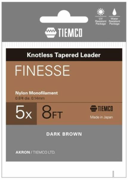 A Tiemco Finesse Tapered Leader első osztályú választás a finom szárazlegyes horgászat szerelmeseinek. Ezeknek a csomó nélküli előkéknek ugyanis vékonyabb fenékrészük van, ami még finomabban és diszkrétebben mutatja be a csalit. Ideális a finom CDC legyekkel vagy más apró csalikkal való dobáshoz, és előny a gyanakvó halakkal szemben. Ezek az előkezsinórok japán csúcs