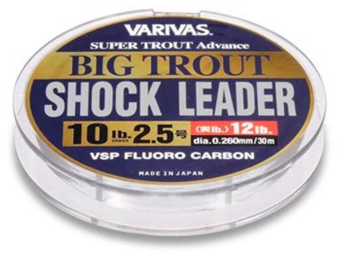 A Varivas Big Trout Shock Leader VSP Fluorocarbon egy olyan előkezsinór, amelyet nagyméretű édesvízi halak, például sügér, pisztráng és lazac pergetésére terveztek. Vékonyabb mégis erősebb, magasabb osztályú szakító- és csomószilárdsággal rendelkezik. Nagyon érzékeny! Ez a zsinór pontos visszajelzést és halérzékelést biztosít, így ideális a nagyméretű édesví