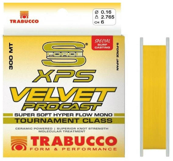 A Trabucco XPS Velvet ProCast speciális, távdobásra kifejlesztett monofil zsinór, melyet a verseny és hobbi horgászok számára is nyugodt szívvel ajánlhatunk. A színe feltűnő, meleg sárga , mely egyaránt jól látható nappal és éjszaka is a ráeső lámpafényben. A zsinór nagyon lágy, kézbe fogva selymes tapintású, melyet speciális szilikonos kezelésének köszönhet. Tov