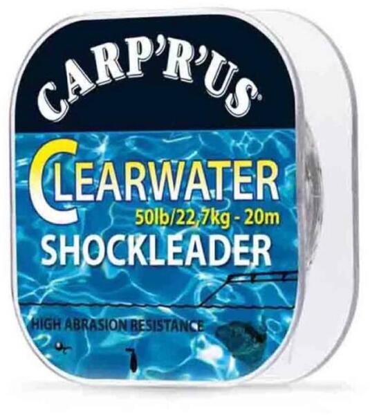 Carp'R'Us Clearwater Shock Leader előtétzsinór 50lb 20m új fajta fluorocarbon, mely Japánban készül annál a cégnél, ahol 40 évvel ezelőtt feltalálták ezt az új anyagot. A Clearwaternek van nyúlása, mely lehetővé teszi, hogy nagy csomótűréssel rendelkezzen. A piacon nagyon sok féle fluorocarbon zsinórt találhatunk, de a többségének ugyan az a hibája, törékenyek, nehé