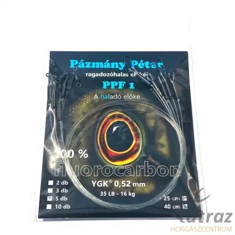 Pázmány Péter Fluorcarbon Előke 40cm 0,52mm - Ragadozóhalas Előkezsinór 5 db/csomag A 0,52 mm átmérőjű YGK 100% fluorocarbon zsinórból készült kész előke, amely óvatos fárasztás mellett ideális kisebb csukákhoz, illetve csukaveszélyes vizeken balinra és süllőre. A megszokott PPF1 előkéhez képest egy mérettel kisebb kapoccsal van szerelve, így kevésbé korlátozza a