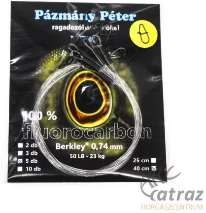 Pázmány Péter Fluorcarbon Eggsnap Előke 40cm 0,74mm - Ragadozóhalas Fluorcarbon Előkezsinór 5 db/csomag A 0,52 mm átmérőjű YGK 100% fluorocarbon zsinórból készült kész előke, amely óvatos fárasztás mellett ideális kisebb csukákhoz, illetve csukaveszélyes vizeken balinra és süllőre. A megszokott PPF1 előkéhez képest egy mérettel kisebb kapoccsal van szerelve, így kev