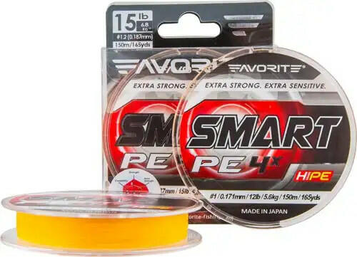 Favorite Smart PE 4x - négyszálas PE fonott zsinór Átmérő: PE #2.5 (0,256 mm) Szakító szilárdság: 30LB (13 kg) Szín: fluo narancs Kiszerelés: 150m Made in Japan A Favorite Smart PE 4X a Favorite márkanév alatt kiadott első fonott zsinór, amely japánban készül és a legtöbb horgász alapvető igényeit kielégíti. Négyszálas H-Grade PE anyagból készült, amely nagy szakít