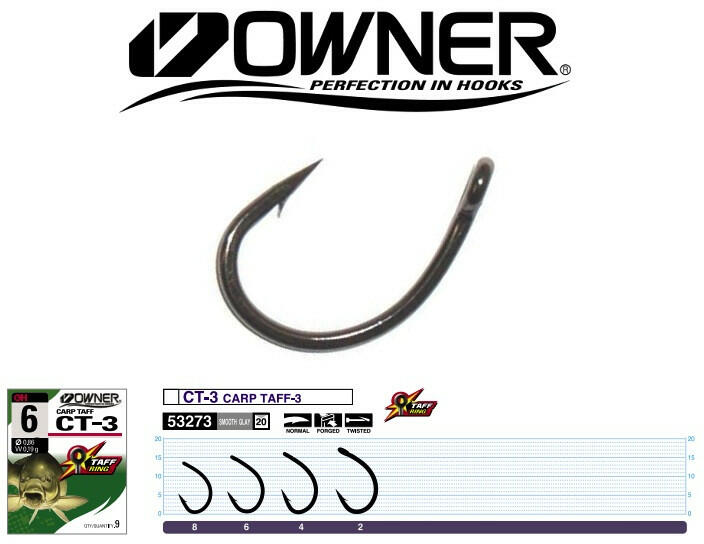 OWNER 53273 CT-t horog az 53263 C-3 típus teflon bevonatos változata. Sötét színű teflonbevonat, erős kialakítás, ívelt szár és enyhén visszatört hegy jellemzi, mely minden nagytestű hal megfogására alkalmassá teszi. Méretei: 2, 4, 6, 8