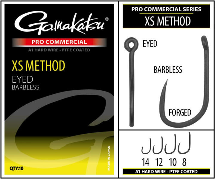 Gamakatsu Coars Pro-C XS Method A1 PTFE BL Füles Szakáll Nélküli Horog #14 PTFE bevonattal Füles, szakáll nélküli horog E nyhén befele forduló tűhegy Tökéletesen ívelt Többféle méretben elérhető 10db/csomag Az XS módszert kizárólag a nagyméretű pontyok megcélzására tervezték. A horog A1 Hard Wire-ből készült, és az eredeti Gamakatsu Specialist RX-en alapul. A szem 1