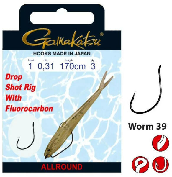 Gamakatsu Preda Booklet Dropshot Worm 39 #4 Előkötött Füles, Szakállas Ragadozó Halas Horog Egyágú 4-es horogméret 0,18mm átmérőjű 170cm hosszú fluorokarbon zsinórral kötött Füles, szakállas horog Fekete színű 3db/csomag Kiváló minőségű előkötött ragadozó halas horog. Egyágú , füles , szakállas horog 170cm hosszú fluorokarbon zsinórral kötött, fekete színben