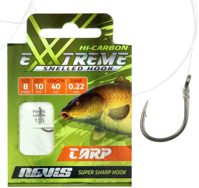 Előkötött pontyozó feeder horog. A Nevis előkötött horog-széria prémium minőségű acélból készült horgokból és felsőkategóriás monofil zsinórókból lett összeállítva. A jó minőségű horgok nem törnek el és nem hajolnak ki még nagyobb terhelések esetén sem. Az adott horgászmódszerre legeredményesebb horog forma, a magas szakítószilárdságú zsinórral kombiná