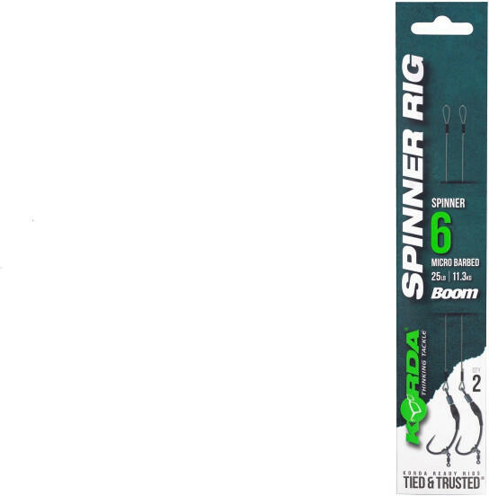 Korda Spinner Rig Spinner 6 25lb Hossz: 5.5 inch Boom Elérhető az új Spinner horoggal 5-ös méretben is kapható Krimpelt verzióban a legerősebb csatlakozás miatt Elérhető Krank és Kurv horgokkal is Ez a Spinner Hook változat az egyetlen előke a készre kötött verziók közül, ami elérhető 5-ös méretben. Ez a horogforma szándékosan a Spinner Rig-gel való használatra tervezt