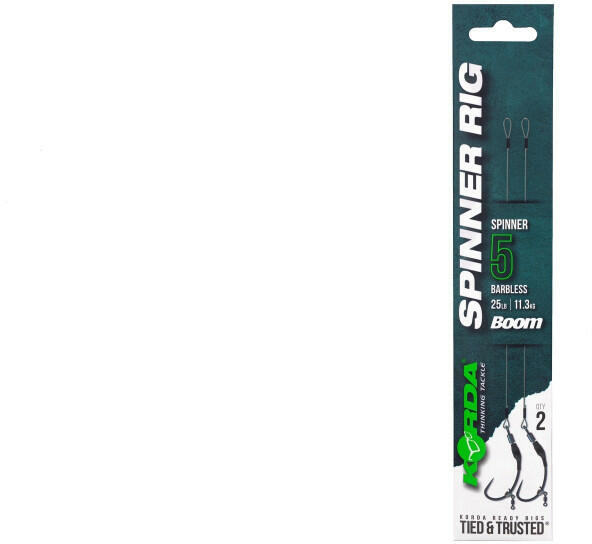 Korda Spinner Rig Spinner Barbless 5 25lb Hossz: 5.5 inch Boom Elérhető az új Spinner horoggal 5-ös méretben is kapható Krimpelt verzióban a legerősebb csatlakozás miatt Elérhető Krank és Kurv horgokkal is Ez a Spinner Hook változat az egyetlen előke a készre kötött verziók közül, ami elérhető 5-ös méretben. Ez a horogforma szándékosan a Spinner Rig-gel való használatra