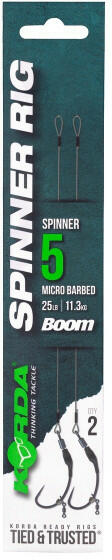 Korda Spinner Rig Spinner 5 25lb Hossz: 5.5 inch Boom Elérhető az új Spinner horoggal 5-ös méretben is kapható Krimpelt verzióban a legerősebb csatlakozás miatt Elérhető Krank és Kurv horgokkal is Ez a Spinner Hook változat az egyetlen előke a készre kötött verziók közül, ami elérhető 5-ös méretben. Ez a horogforma szándékosan a Spinner Rig-gel való használatra tervezt