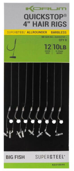 Korum 4" Big Fish Hair Rigs W Quickstops Size 10 Füles Szakáll Nélküli Monofil Előkötött Horog: Előkötött horog használatra készen Quickstop rendszerrel Kiváló a nagy halak fogására Magas szénacélból készült Nagy teherbírású A Korum 4" Big Fish Hair Rigs W/Quickstops egy prémium minőségű előkötött horgászhorog készlet, amelyet kifejezetten nagy halak horgászatáho