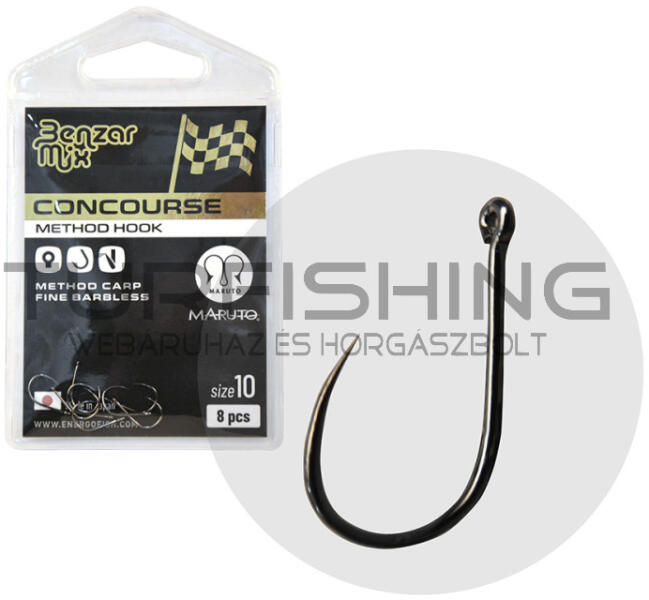 Benzár Concourse Method Carp Fine Barbless horog A Benzár Concourse horogszéria a legjobb minőségű, japánban készült horgokat öleli fel, melyek között elsősorban a method feeder technika kedvelői találhatják meg a nekik leginkább megfelelő variánst. A Fine Carp típus, ahogyan arra a neve is utal, egy kifejezetten a finom method horgászathoz optimalizált modell, amely vékonyh