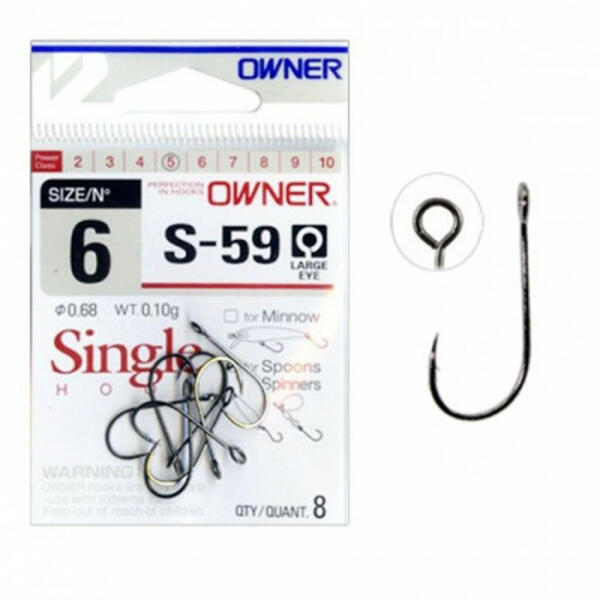 OWNER 51580 S-59 horga kifejezetten rablóhalas technikákhoz lett fejlesztve. A horog füle extra méretű, így akár hármas horgok helyett woblerekre, akár csaburaskara feltehető. Tűhegyes, erős, hogy a keményebb szájú ragadozók esetén is tökéletesen akadjon. Méretek: 2, 4, 6, 8, 10
