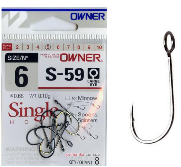 Modell: Owner S-59 Típus: Single (egyágú) Méret: #8 Specifikáció: Large Eye (nagyfülű) Kiszerelés: 9 db Átmérő: 0,60 mm Tömeg: 0,069 g Japánban készül Az Owner S-59 horog esősorban a pisztrángos műcsalik hármashorgainak helyettesítésére szolgáló nagylyukú egyágú horog. Viszont legendásan híres lett a Light és Ultra-Light gumihalas és egyéb plasztikcsalis pergető h