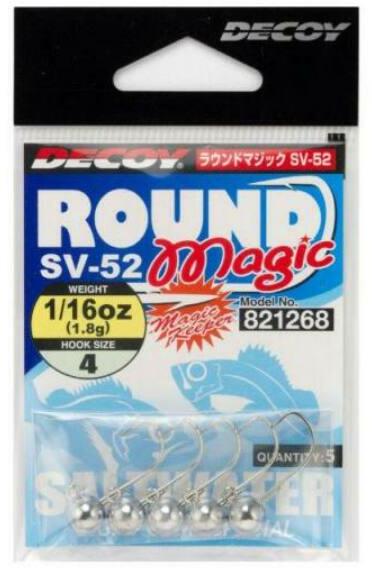 A Decoy SV-52 Round Magic jigeket szénacélból készült japán horgokra öntik, amelyeket egy speciális kémiai technológiával éleznek, amely garantálja a nagy átütőerővel rendelkező éles hegyet. Minden egyes jig egyedileg tesztelt és kifejezetten puha csalikhoz tervezett, mivel nem befolyásolja az ilyen csalik természetes úszómozgását. A Decoy SV-52 Round Magic jignél nagy f
