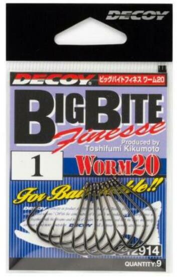 A legfejlettebb horgok közé tartozik a Decoy Worm 20 Big Bait Finesse. A szöget, a hajlítást, a vastagságot és a horgot gondosan átgondolták és mikro pontossággal állították be, hogy a lehető legjobb eredményt érje el a halak elleni küzdelemben. A horgokat független tudományos keménységi és szilárdsági vizsgálatoknak is alávetették, és az eredmények megerősítették