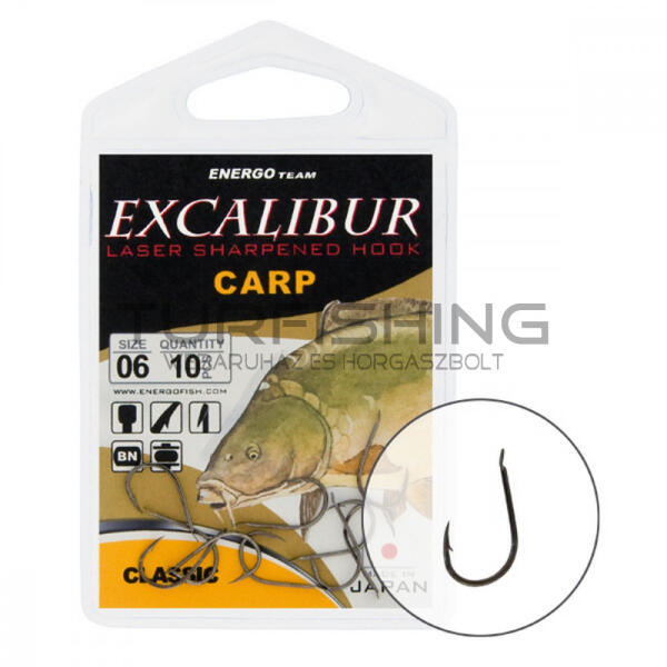 Excalibur Carp Classic NS horog Extra minőséget képviselő, speciális hegykiképzésű, tűhegyes, klasszikus formájú, fekete színű, extra erős pontyozóhorog. Szabályos kerekded formájának köszönhetően csemegekukoricához, minden finomszerelékes horgásznak tökéletes választássá teszik. Japánban készült, mely garancia a minőségre. Lapkás kialakítású, 1-14-es méretbe