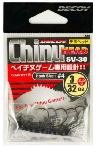 A Decoy SV-30 Chinu Head jigeket szénacélból készült japán horgokra öntik, amelyeket egy speciális kémiai technológiával éleznek, amely garantálja a nagy átütőerővel rendelkező éles hegyet. Minden egyes jig egyedileg tesztelt és kifejezetten puha csalikhoz tervezett, mivel nem befolyásolja az ilyen csalik természetes úszómozgását. A Decoy SV-30 Chinu Head jignél nagy fig
