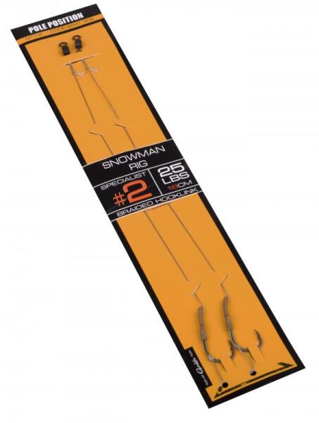 Spro Pole Position széria, Gamakatsu Specialist horoggal! A Snowman Rig kimondottan lebegőcsalizáshoz beállított pontyozó végszerelék, horogbefordítóval. Minimum rendelés: 5 db (1 doboz) Méret: 2 Szín: fekete Szakáll: Szakállas Fültípus: Füles Előke: 18 cm/25 lb Kiszerelés: 2 db/cs