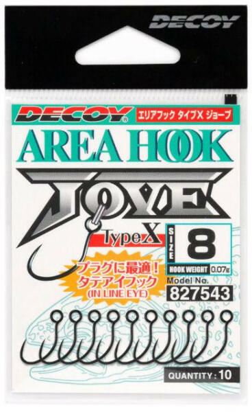 Gyártó: Decoy Modell: Area Hook type-X AH-10 JOVE barbless (szakáll nélküli) Horog méret: #6 Szín: matt szürke Kiszerelés: 10 db/csomag Származási hely: Japán A Decoy Area Hook Type-X AH-10 JOVE egy kiváló minőségű horog, mely speciálisan tervezett a Light pergető horgászok számára. A horog a Decoy japán márka kínálatában található, és a legmagasabb színvonalú anyag