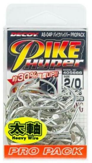 A Decoy AS-04P Pike Hyper Pro Pack horgok a legmagasabb minőségű japán horgok. Erősek és rendkívül élesek, így kiváló választás jigeléshez, de nagyon jól használhatóak élő csalis horgászathoz is. A horgok négyszögletes profilú, kovácsolt acélból készülnek, és az elektrokémiailag élezett szár hosszú élettartamot biztosít.