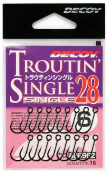 A Decoy 28 Troutin Single horgok a legmagasabb minőségű japán horgok. A horog erős és rendkívül éles, egyedi és agresszív formájú, és nagy az átütő ereje. A horgok japán kovácsolt acélból készülnek, nikkelezett felületűek, és az elektrokémiailag élezett hegy hosszú élettartamot biztosít.
