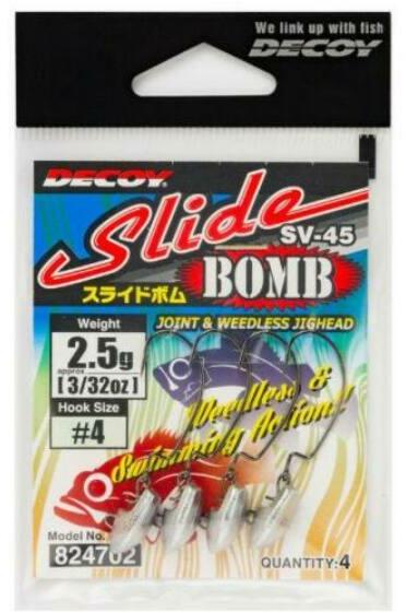 A Decoy SV-45 Slide Bomb jigeket szénacélból készült japán horgokra öntik, amelyeket egy speciális kémiai technológiával éleznek, ami garantálja a nagy átütőerővel rendelkező éles hegyet. Ez egy nagyon részletesen megtervezett jig, amely könnyen használható minden súlyhoz és mérethez. Minden egyes horgot külön-külön elektronikusan tesztelnek. Ez a jig modell a csalik