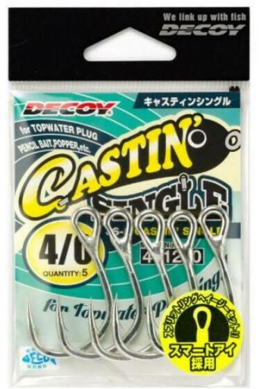 A Decoy JS-5 Castin Single egy speciális horog, széles, rövid szárral és rendkívül éles heggyel. A horgokat a felsővízi (felszíni) horgászathoz tervezték. Kovácsolt acélból készültek, és nikkelezett bevonatúak. Ezen kívül a hegyet egy speciális technológiával élezik, ami hosszú élettartamot biztosít, és korrózióálló is.