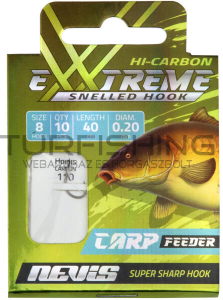 Előkötött pontyozó feeder horog. A Nevis előkötött horog-széria prémium minőségű acélból készült horgokból és felsőkategóriás monofil zsinórókból lett összeállítva. A jó minőségű horgok nem törnek el és nem hajolnak ki még nagyobb terhelések esetén sem. Az adott horgászmódszerre legeredményesebb horog forma, a magas szakítószilárdságú zsinórral kombiná
